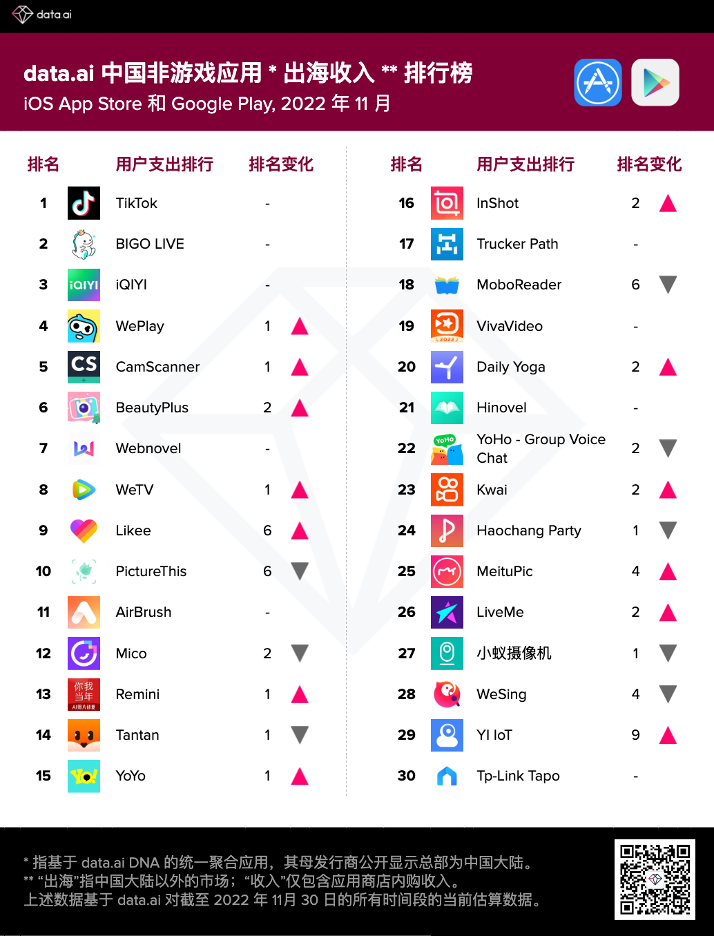 依据 data.ai 发布的 2022 年 11 月我国非游戏厂商及使用出海收入 30 强榜单,非游戏厂商收入榜单前三名(按排名先后顺序)为字节跳动、相聚集团、腾讯,比较十月排名无变化。在头部榜单方位,美图排名行进1名,夺得第四。爱奇艺持续坚持上升趋势,行进1名,取得第五。爱奇艺在许多东南亚国家都有增加,依据data.ai的预算数据,收入方面,泰国是现在爱奇艺除我国以外的最大商场。2022年年头它在泰国的iOS&Google非游戏类使用收入排名中仅为第八,而截止2022年11月30日,它的排名已是继Youtube、TikTok和LINE之后的第四位。赤子城科技排名上升至第九。赤子城科技于2021年下半年推出新交际谈天渠道《SUGO:Random Chat, Make Friends 》,该使用已在中东和南亚商场取得重大进展,如沙特阿拉伯、埃及和印度。2022年11月,其全球收入同比增加660%以上。