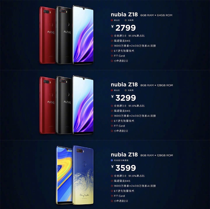 6GB+64GB版别的努比亚Z18价格2799元,而8GB+128GB的价格为3299元。除了以上的版别之外,努比亚Z18推出了梵高星空典藏版,机身经过“琥珀凝雕”工艺完成了玻璃突变与金属中框突变的一致,价格为3599元。